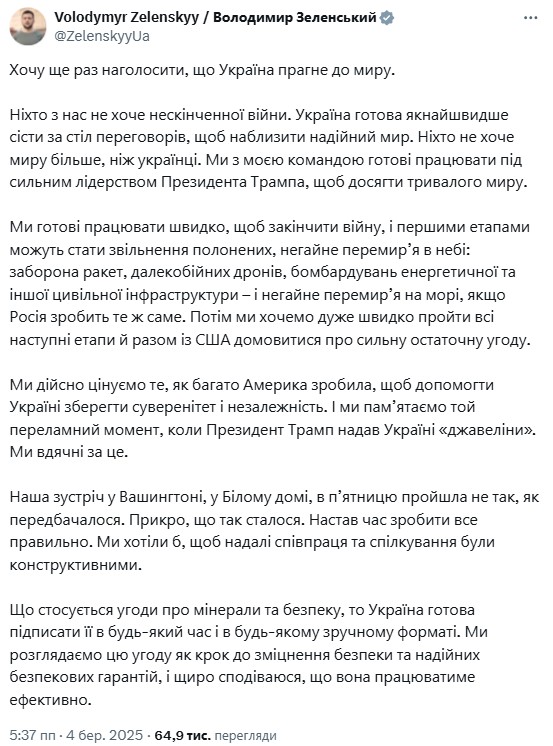 «Наша встреча в Вашингтоне, в Белом доме, в пятницу прошла не так, как предполагалось. Обидно, что так произошло. Пришло время сделать все правильно. Мы хотели бы, чтобы в дальнейшем сотрудничество и общение были конструктивными», — написал президент Украины.
