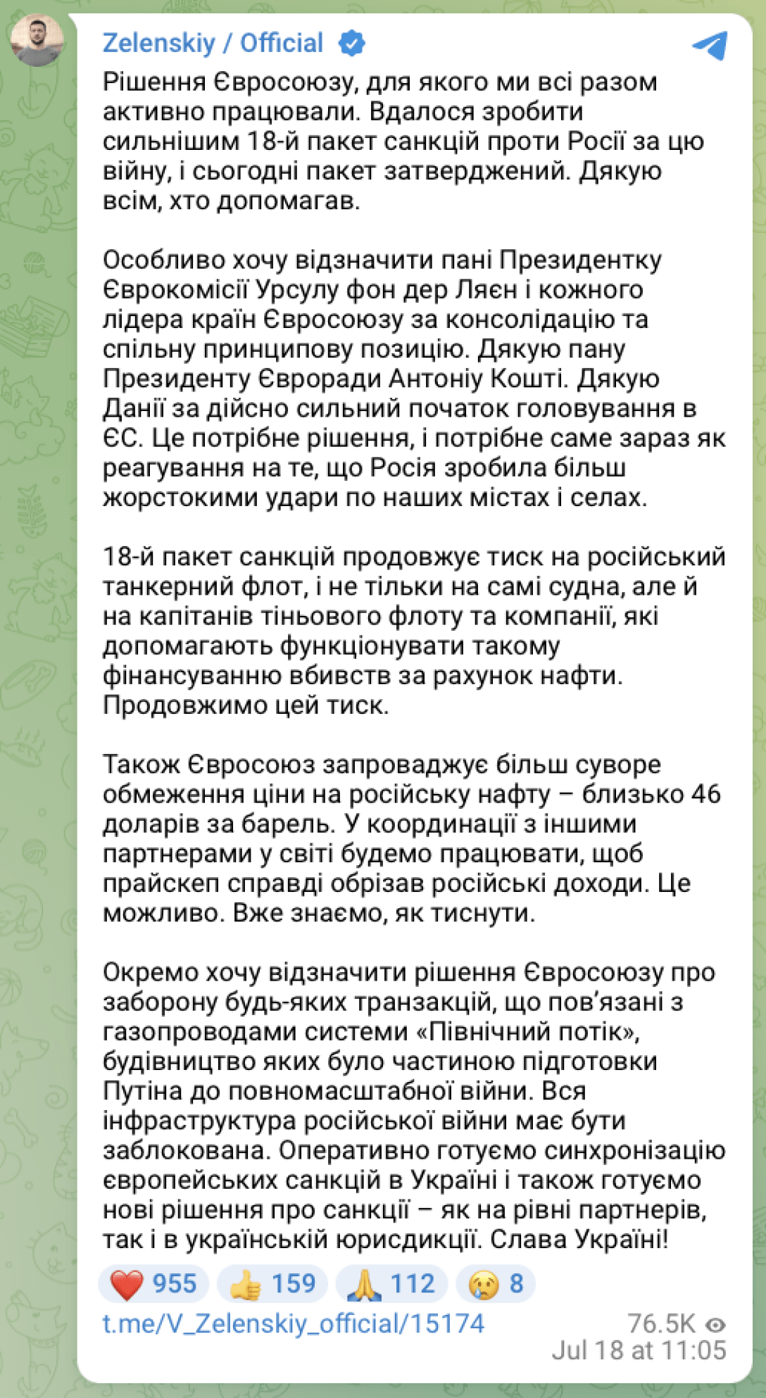 Президент подчеркнул, что над решением Евросоюза о 18-м пакете антироссийских санкций «все вместе активно работали». Он поблагодарил всех, кто помогал достичь утверждения этих ограничений.