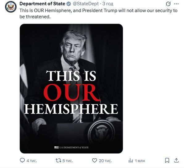 В сообщении, опубликованном 5 января, Государственный департамент США заявил, что Западное полушарие Земли – это зона их интересов.