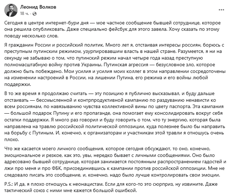 «Что же касается моего личного сообщения, которое сегодня обсуждают, то оно, конечно, эмоциональное и резкое, как это, увы, нередко бывает с личными сообщениями. Оно было адресовано бывшей сотруднице, которая занимается постоянным распространением гадостей и лжи про меня и про ФБК, присоединившись к кампании против российской оппозиции. Мне не следовало писать это сообщение, и, конечно, надо было лучше контролировать свои эмоции. P.S.: И да, я плохо отношусь к неонацистам. Если для кого-то это сюрприз, ну извините. Даже тактический союз с ними мне кажется большой ошибкой», – говорится в его сообщении.