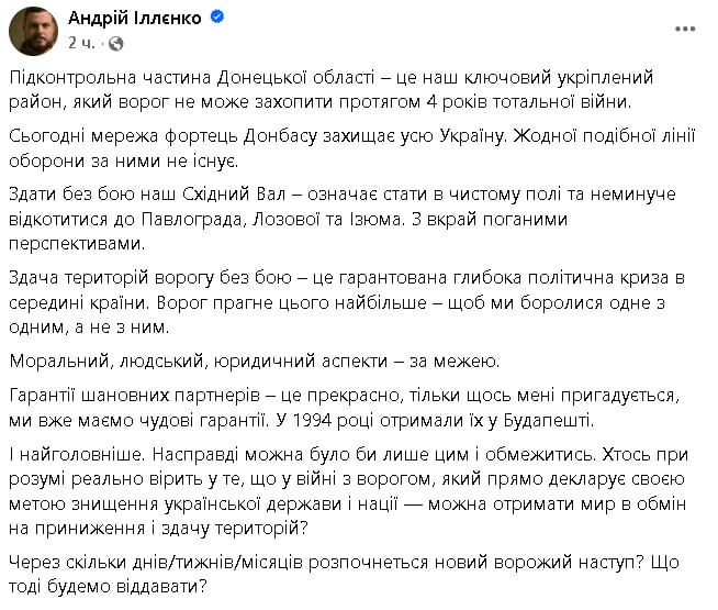 «Кто-то в здравом уме реально верит в то, что в войне с врагом, который прямо декларирует своей целью уничтожение украинского государства и нации — можно получить мир в обмен на унижение и сдачу территорий? Через сколько дней/недель/месяцев начнется новое вражеское наступление? Что тогда будем отдавать?», — спросил Андрей Ильенко.