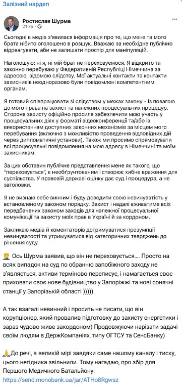 Позже на своей странице в Facebook Ростислав Шурма отреагировал на подозрение НАБУ и заявил, что он не скрывается от следствия и готов сотрудничать, однако на расстоянии, поскольку проживает в Германии.