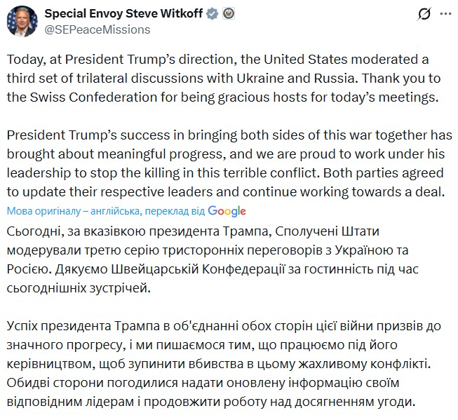 Сообщение Уиткоффа с оценкой первого дня переговоров в Женеве появилось в соцсети X в 6 часов 18 февраля. В первую очередь спецпредставитель США поблагодарил Швейцарию, которая приняла делегации, а затем вспомнил Трампа и промежуточные итоги встреч. По его словам, успех заключается в том, что удалось «объединить обе стороны» и таким образом работают над «остановкой убийств в этом ужасном конфликте».